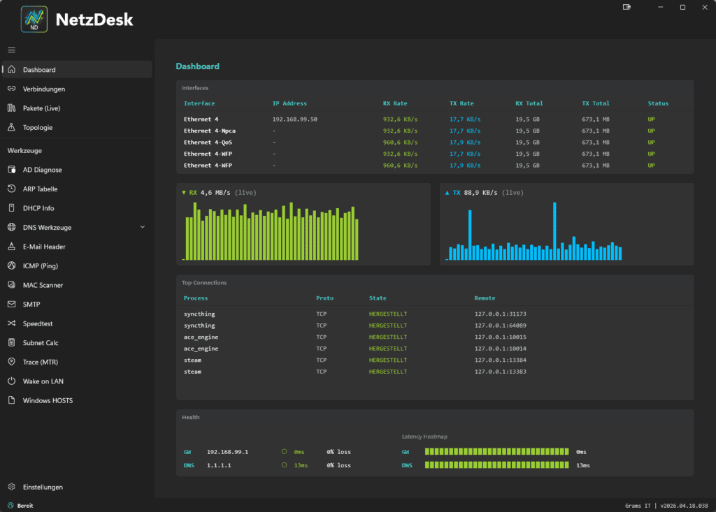 NetzDesk ist kein weiteres simples „Ping-Tool“, sondern ein kompletter, von Grund auf neu entwickelter Werkzeugkasten für alle, die wirklich sehen wollen, was in ihrem Netzwerk passiert.