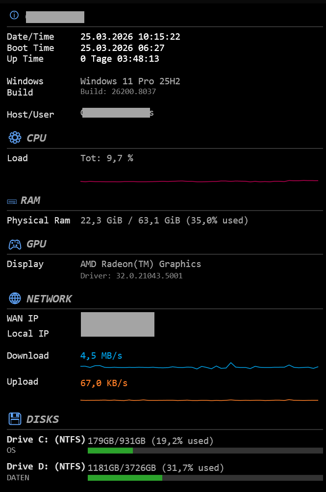 • ⚙ CPU / 🖴 RAM / 🎮 GPU: Ein Klick bringt dich direkt in den Task-Manager.